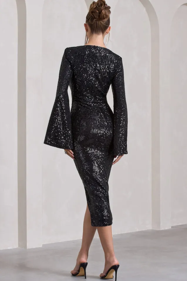Amber | Black Sequin Plunge Wrap Midi Dress with Cape Sleeves and Front Split