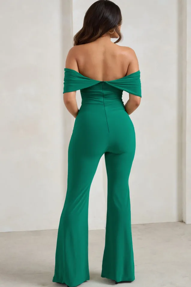 Bonnie | Green Bardot Drape Sleeve Jumpsuit