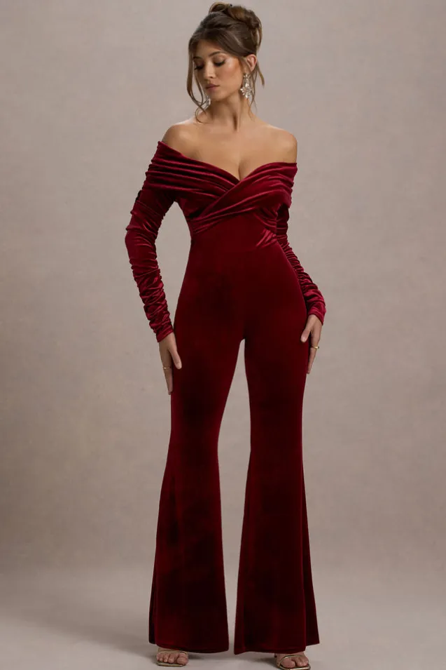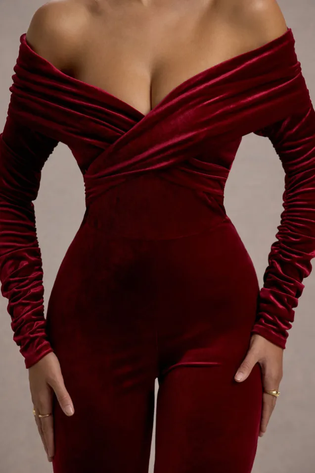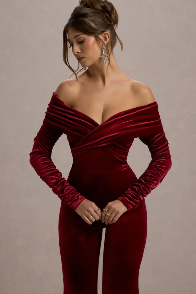 Borealis | Berry Velvet Long-Sleeved Bardot Jumpsuit