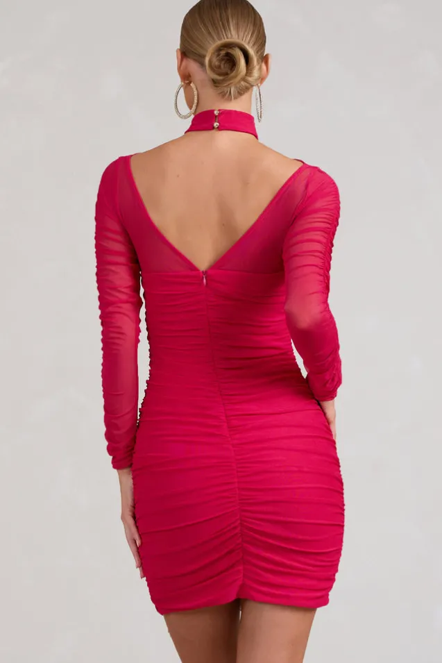 Bouquet Toss | Hot Pink Ruched Mesh Long-Sleeved Mini Dress
