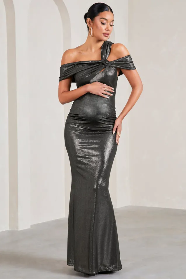 Captivating | Silver Metallic Strappy Asymmetric Cut-Out Maternity Maxi Dress