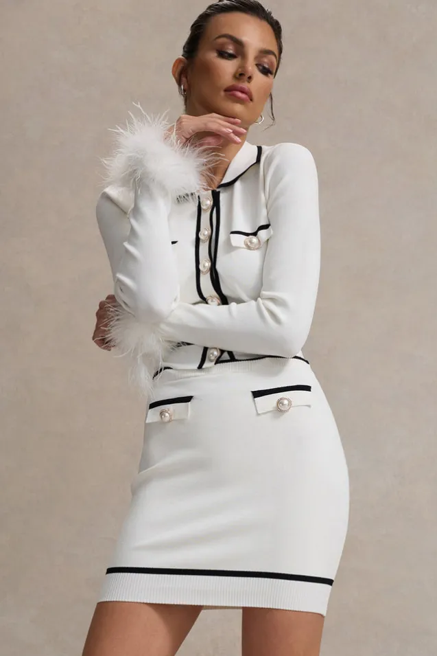 With multiple couture-like details, Coco Crush is a luxurious addition to any wardrobe. Crafted in a cream fine knit fabric, this cropped cardigan is elevated by eye-catching pearl buttons and statement feather cuffs. For a match made in heaven, style yours with its matching skirt, Seine.Features – Premium fine knit- Cropped fit- Pearl buttons- Mock pockets- Long sleeves- Feather trims- Contrast pipingSizing & Fit Model is 5’7 and wears UK size 8/US size 4 Product Information Designed exclusively by Club L London Unlined with good stretch Premium fine knit in Cream (52% Rayon, 30% Polyamide, 18% Elastane) Trim (100% real feathers)42cm total length