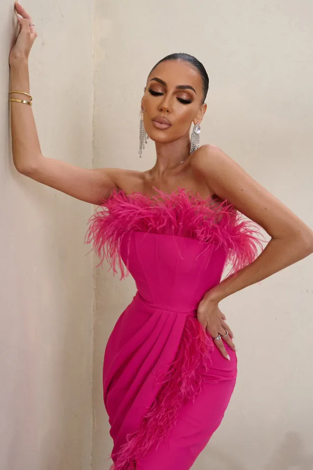 Cosmo | Hot Pink Bandeau Corset Maxi Dress With Feather Trim