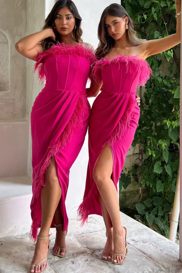Be the first to review “Cosmo | Hot Pink Bandeau Corset Maxi Dress With Feather Trim” Cancel reply