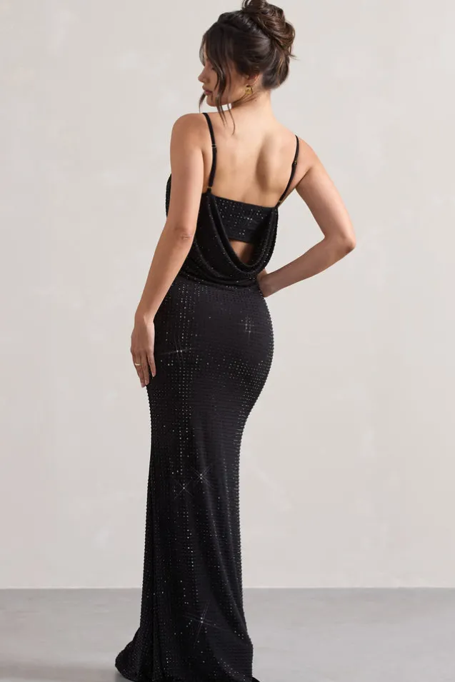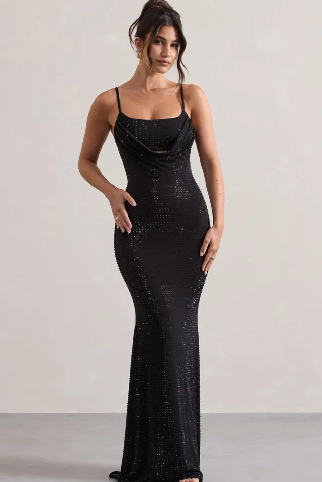 Costella | Black Embellished Strappy Cowl-Neck Maxi Dress