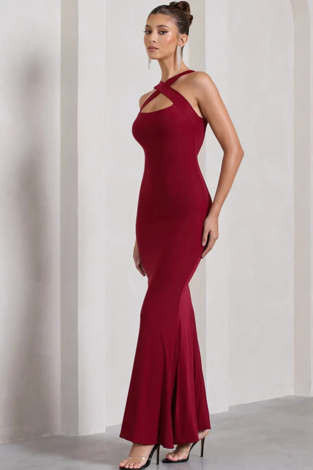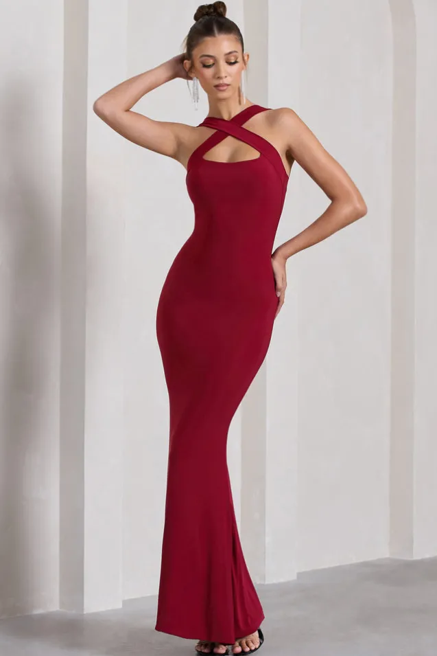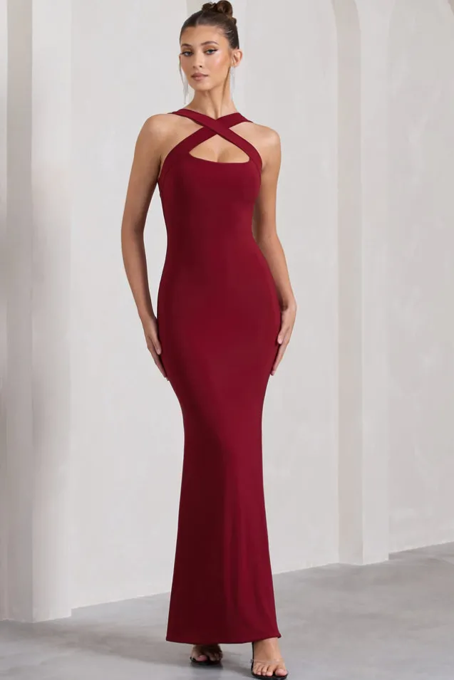 Cross My Heart | Berry Red Sleeveless Cross-Neck Maxi Dress