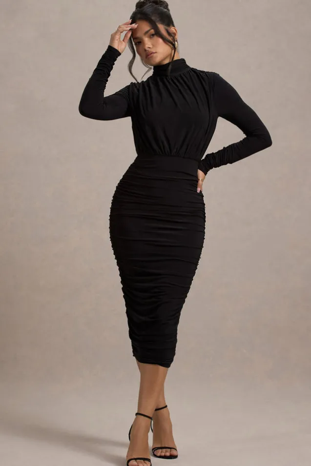 Dasha | Black Ruched High-Neck Long-Sleeve Midi Dress