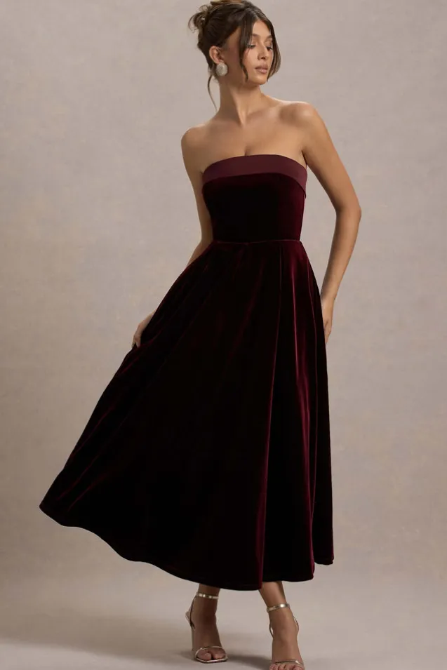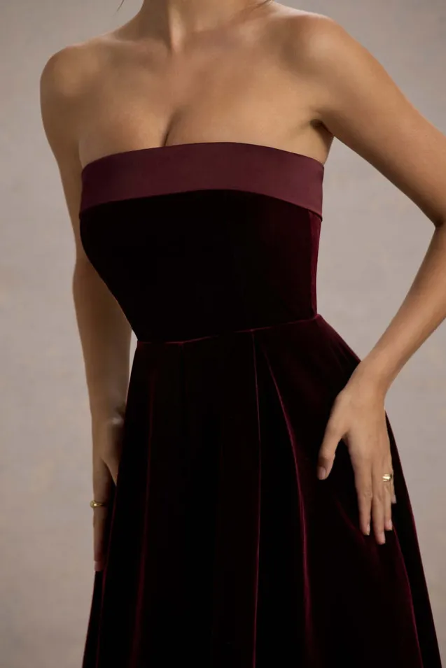 Defined by its rich texture and timeless elegance, Delray is a sophisticated choice for your next special occasion. Wrapped in our premium port velvet, this bandeau midi dress is designed to highlight your silhouette with its sleek, fitted shape. The subtle satin detailing adds a touch of refinement, elevating the overall look. Perfect for an evening soiree or a formal dinner, keep Delray in focus with minimalist accessories and classic heels to exude effortless grace and style.Features – Premium velvet and satin- Folded bandeau neckline – Invisible zip closure – Pleated skirt- Mesh underskirt- Midi length Sizing & Fit Model is 5’7 and wears UK size 8/US size 4 Product Information Designed exclusively by Club L London Double layered/good stretch Premium velvet and satin in Port (93% Polyester, 7% Elastane)Lining (97% Polyester, 3% Elastane)85cm total length