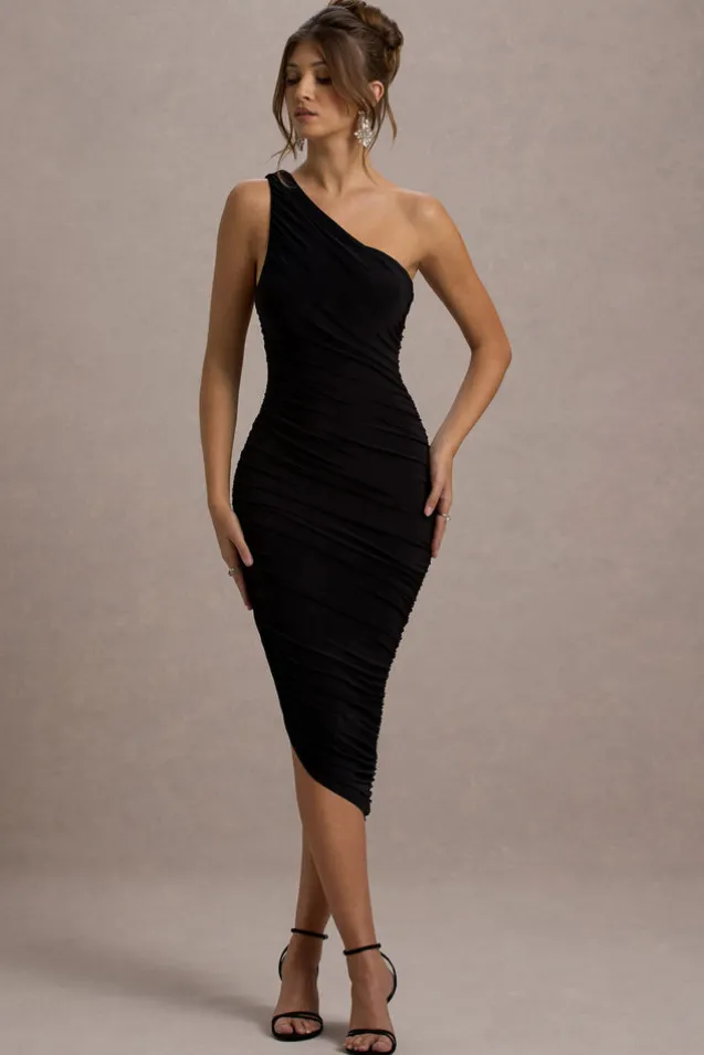 Dorit | Black One Shoulder Asymmetric Ruched Midi Dress