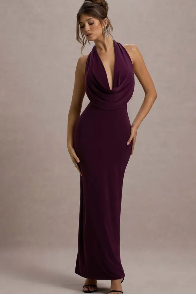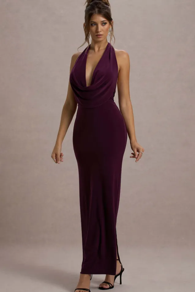 Simple yet seductive, turn heads in Edessa. Designed in a rich port shade of our curve-enhancing jersey, this statement staple boasts a plunging cowl neckline, self-tie halter and sultry open back. Features – Premium stretch jersey- Plunge cowl neckline – Self-tie halter- Open back- Maxi length Sizing & Fit Model is 5’7 and wears UK size 8/US size 4 Product Information Designed exclusively by Club L London Double layered/good stretch Premium jersey in Port (95% Polyester, 5% Elastane) 153cm total length