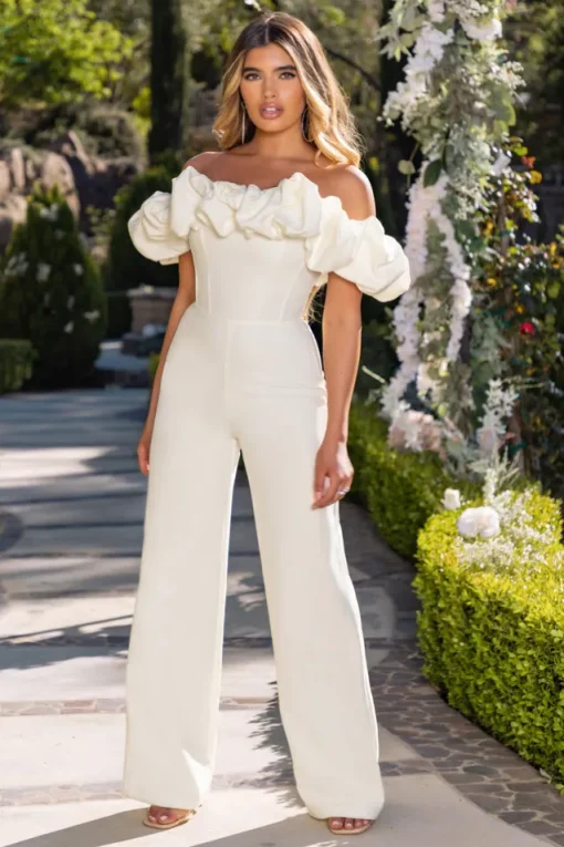 Enchanted | Ivory Puff Bardot Wide Leg Jumpsuit