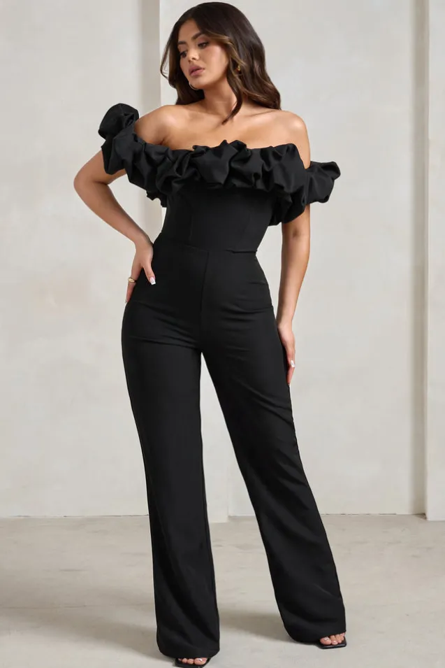 A fine trim of voluminous ruffles makes this short-sleeved jumpsuit truly unforgettable. Perfect for bridesmaids, bachelorettes and birthday girls, our Enchanted boasts a Bardot silhouette made from premium black crepe with boning to define your waistline, sculpting darts and wide yet well-tailored legs.Features- Premium stretch crepe- Puff Bardot sleeves- Shaping waist darts- Boned bodice- Concealed grip tape- Concealed hook and zip closure- Wide legSizing & FitModel is 5’7″ and wears UK size 8/US size 4Product InformationDesigned exclusively by Club L LondonFully lined with stretchPremium crepe fabric in Black (92% Polyester, 8% Elastane)84cm inside leg length