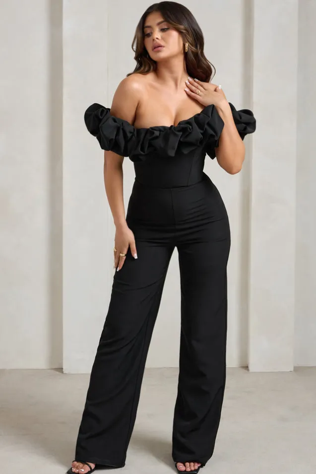 Esmie | Black Structured Statement Bardot Wide Leg Jumpsuit