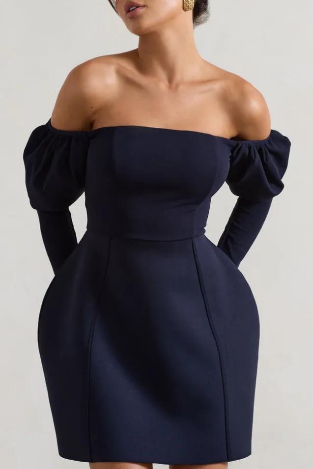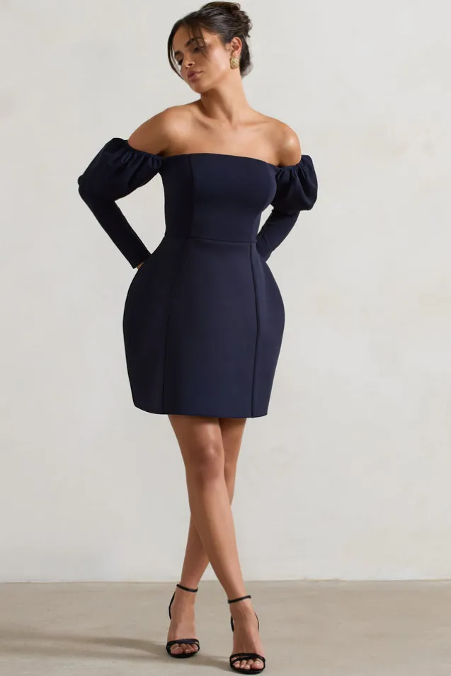 Evangeline | Navy Structured Bardot Puff-Sleeve Mini Dress