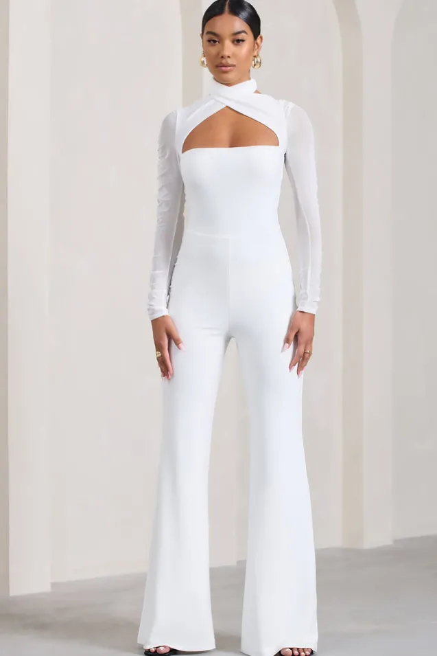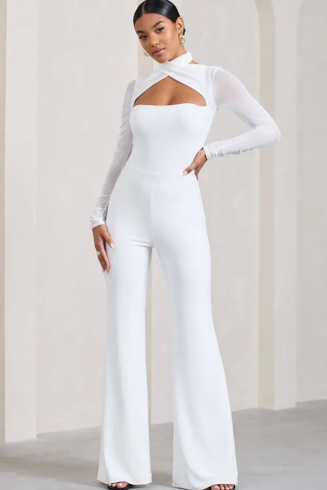 Fallon | White Flared-Leg Jumpsuit With Long Mesh Sleeves