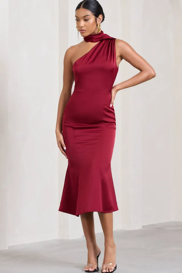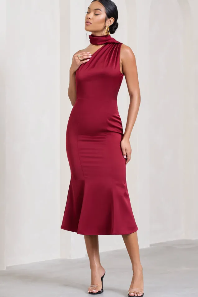 Golden Girl | Burgundy Satin One Shoulder High-Neck Flared Midi Dress