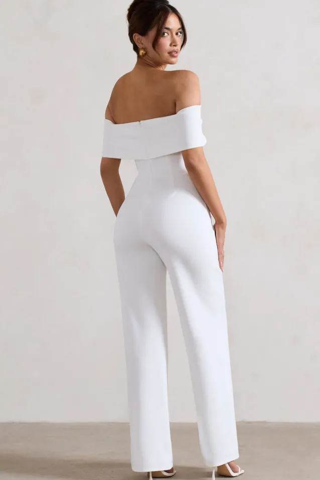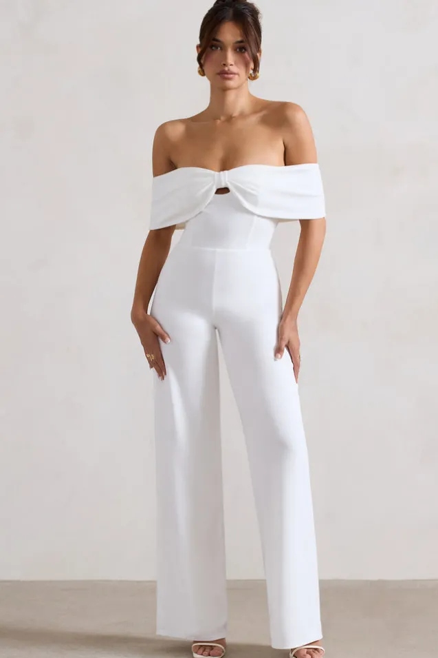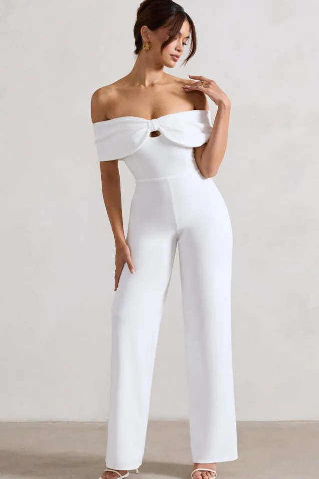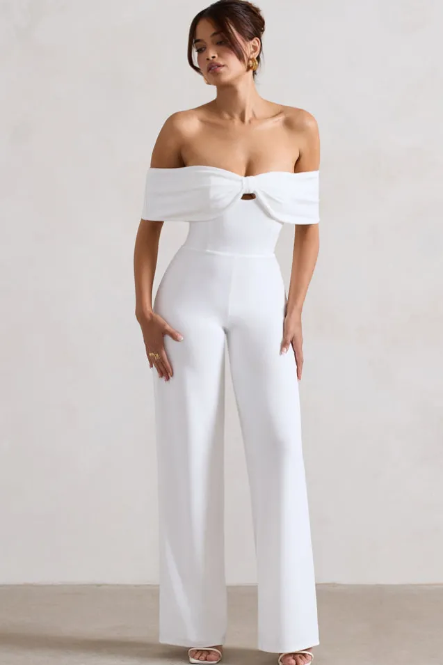 Harleen | White Bow Bardot Wide-Leg Jumpsuit