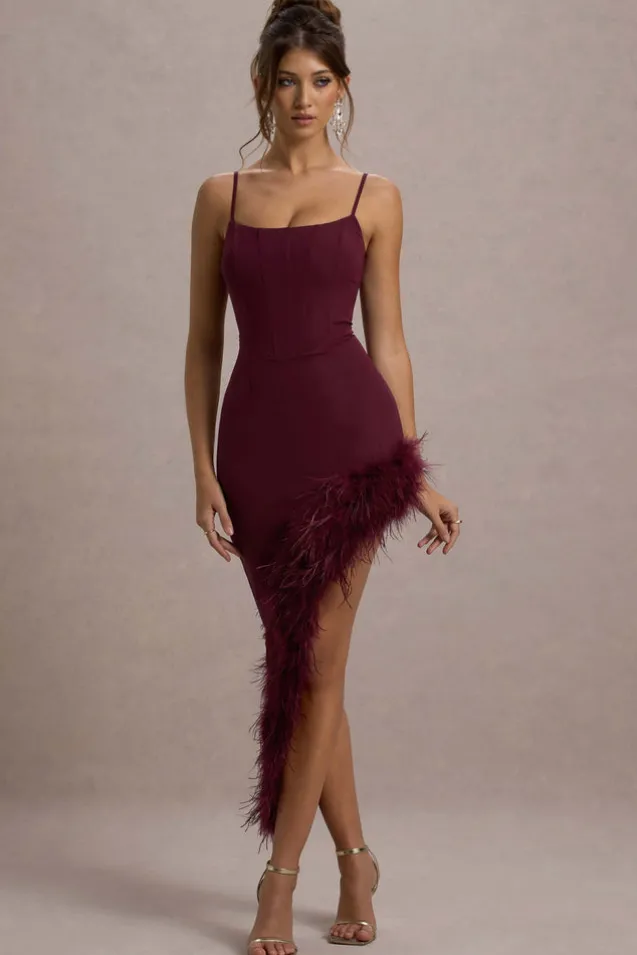 High Status | Burgundy Strappy Corset Asymmetric Maxi Dress With Feather Trim