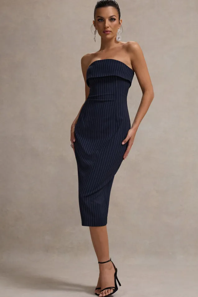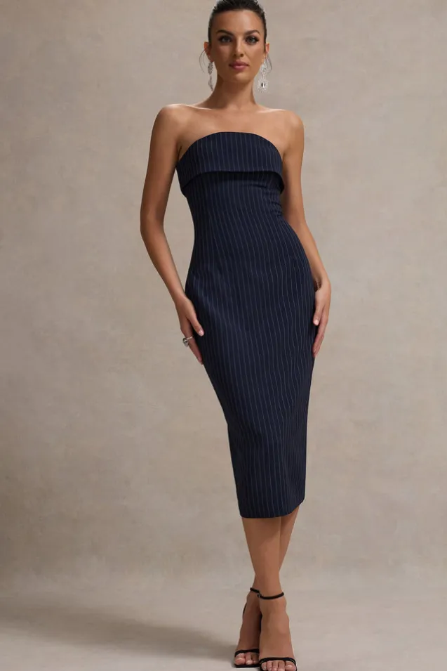 Play with pinstripe at your next event in Highway, our navy midi dress. Carefully crafted in a premium woven fabric, this strapless staple features a folded bandeau neckline, tailored silhouette and functional split hemline. Features – Premium woven- Tailored fit- Folded bandeau neckline- Split hemline- Midi lengthSizing & Fit Model is 5’8 and wears UK size 8/US size 4Product Information Designed exclusively by Club L London Partially lined with no stretch Premium woven fabric in Navy Pinstripe (92% Polyester, 6% Elastane, 2% Viscose) Lining (97% Polyester, 3% Elastane)125cm total dress length