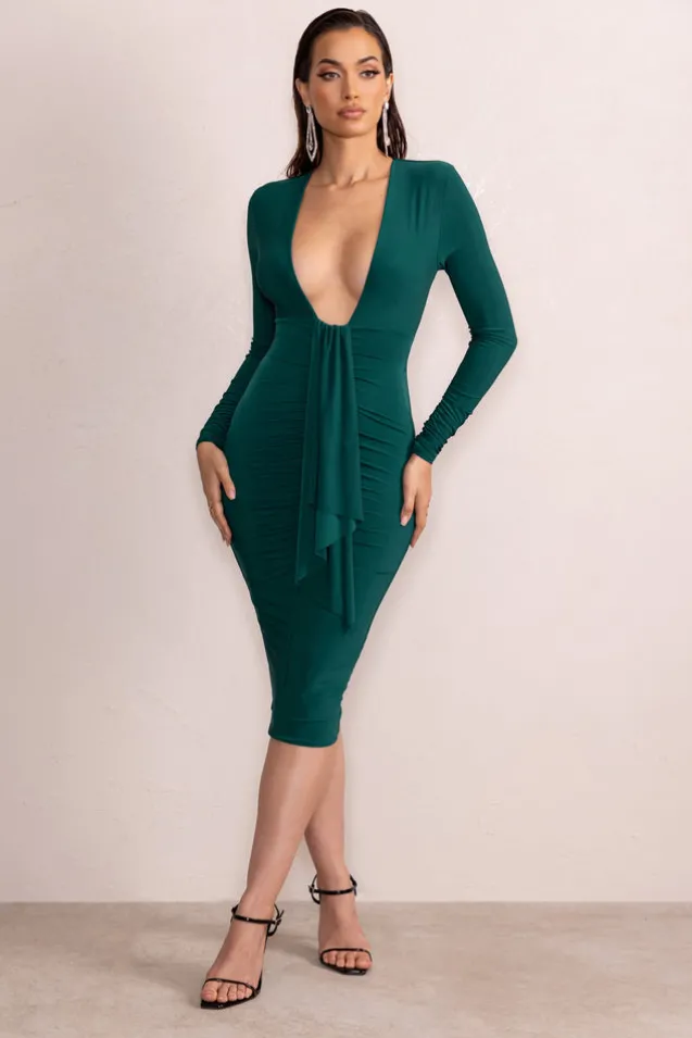 A gorgeous design that is a dream come true… our Inspirational midi dress is pure sophistication with its daring plunge neckline revealing your feminine decolletage, long sleeves, front drape detail and silhouette enhancing ruching creating that desired hourglass figure. Constructed in our luxe jersey fabric in an elegant bottle green hue, this dress is perfect for birthday parties, VIP invites and black-tie events. This premium dress is everything you need!Features- Plunge neckline- Long sleeves- Front drape detail- Bodycon fit- Ruching detail- Premium jersey fabricSizing & FitModel is 5’7 and wears UK size 8/US size 4Product InformationDesigned exclusively by Club L LondonFully lined and with a good amount of stretchStretch Jersey fabric (95% Polyester 5% Elastane)Length from top of shoulder to hem: 115cm