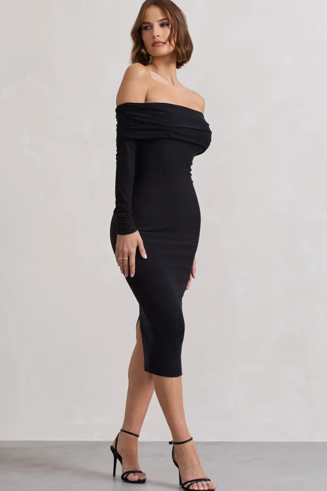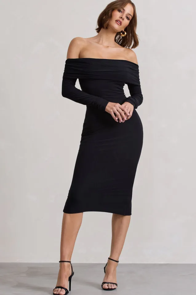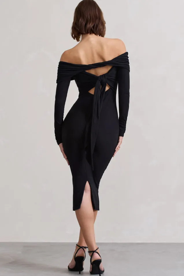 Intercept | Black Bodycon Bardot Tie-Back Midi Dress