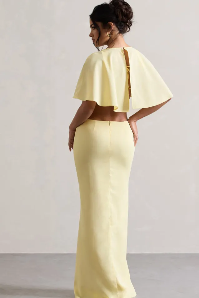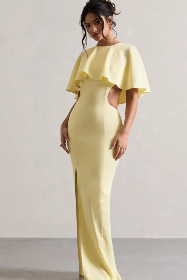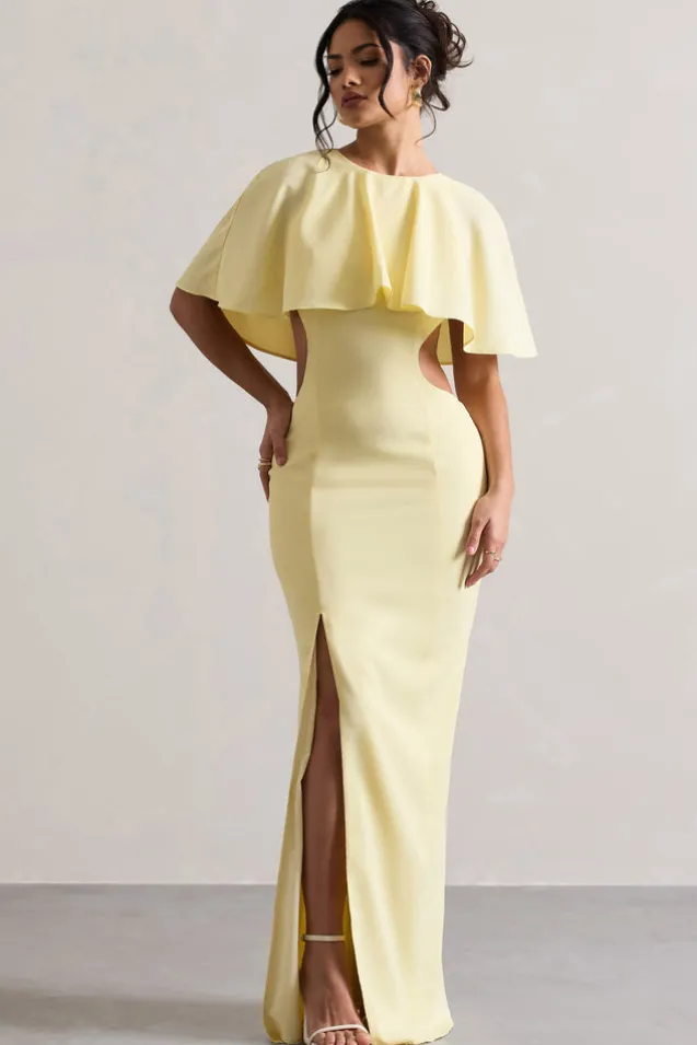 Isadora | Pastel Yellow Cut-Out Split Maxi Dress With Cape
