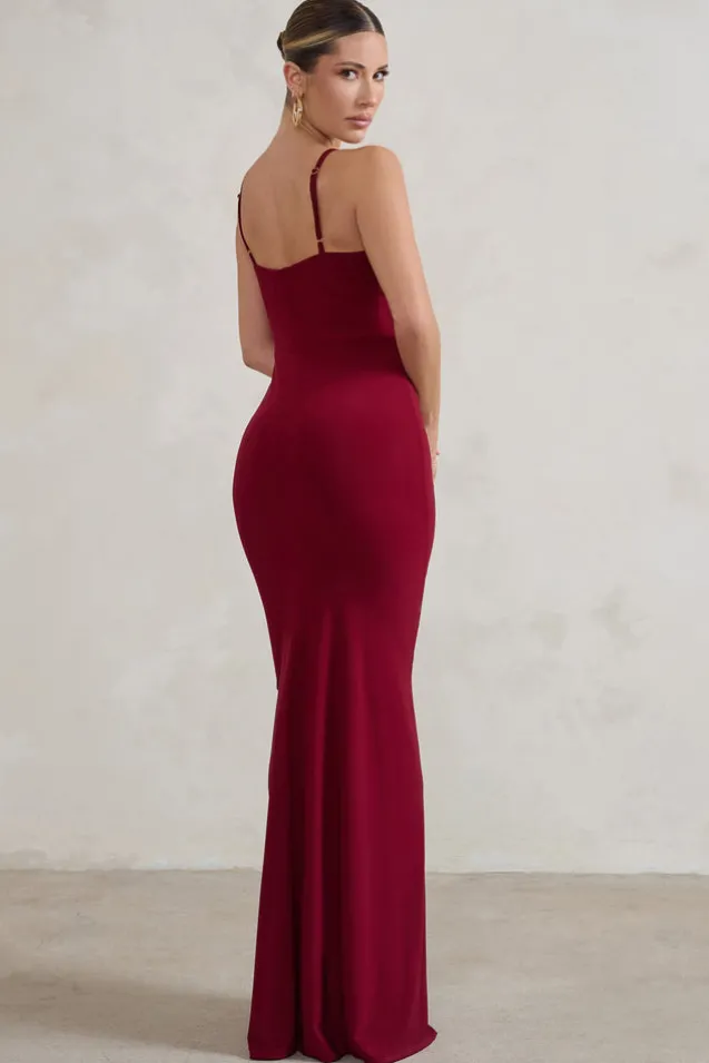Jeanne | Berry Red Plunge Ruched Cami Maxi Dress With Split