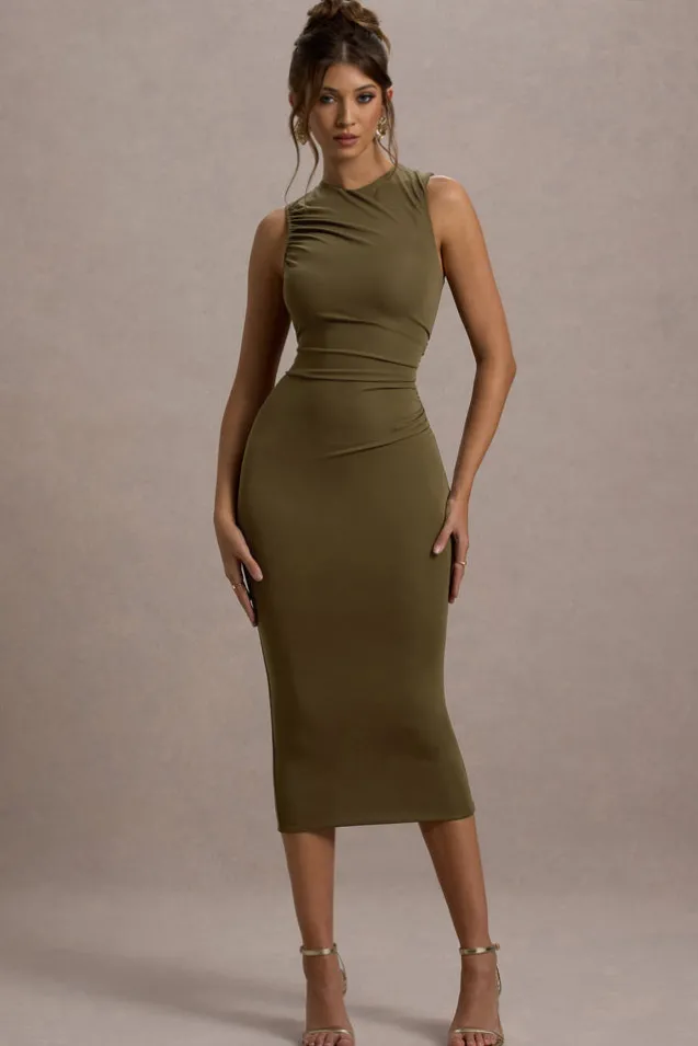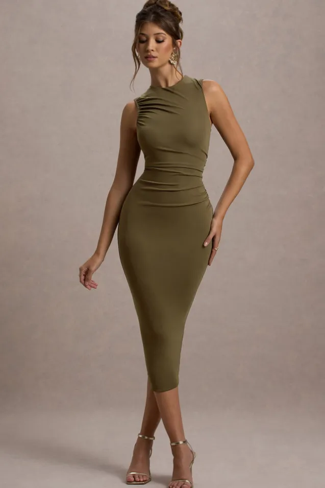 Jemma | Khaki Bodycon Ruched Midi Dress