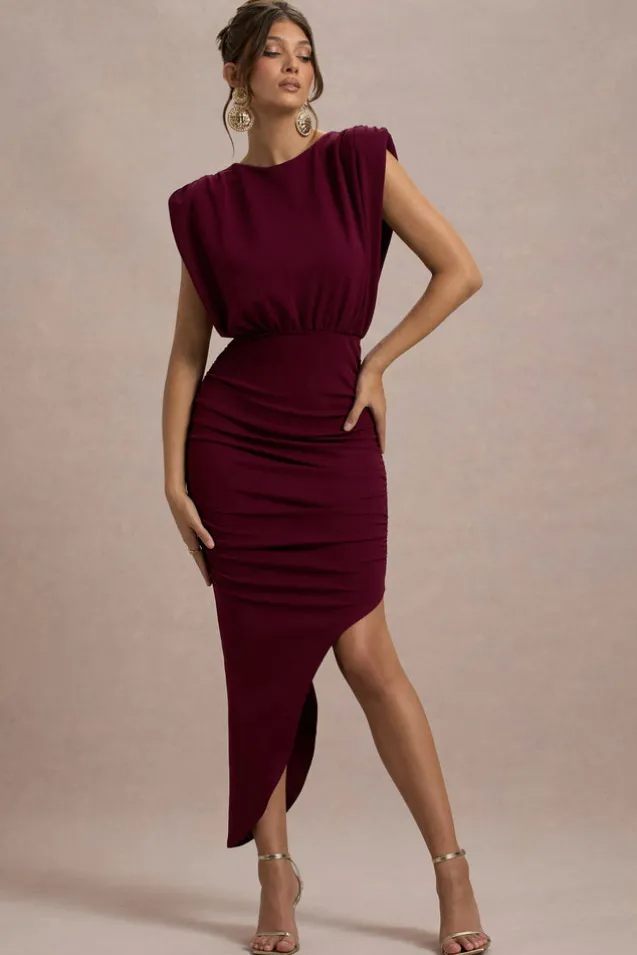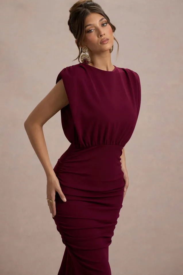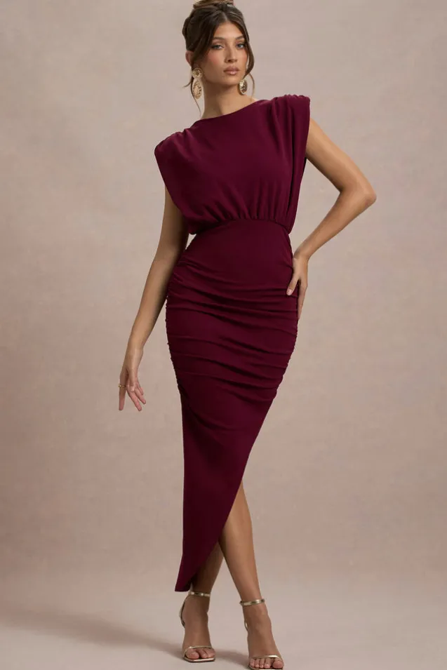 Designed in a timeless, sophisticated silhouette, Jennifer is a stand-out staple. Providing all-day comfort in our signature stretch crepe, this port maxi features a gathered waistline, shoulder padding and asymmetric hem for a flattering fit. For an elevated evening ensemble, try pairing yours with our Joseline gold earrings.Features – Premium stretch crepe- Shoulder padding- Button-closed collar- Keyhole cut-out- Invisible zip closure – Ruched skirt- Asymmetric hemline- Maxi length Sizing & Fit Model is 5’7 and wears UK size 8/US size 4Product Information Designed exclusively by Club L London Double layered with good stretch Premium crepe in Port (95% Polyester, 5% Elastane) 140cm total length