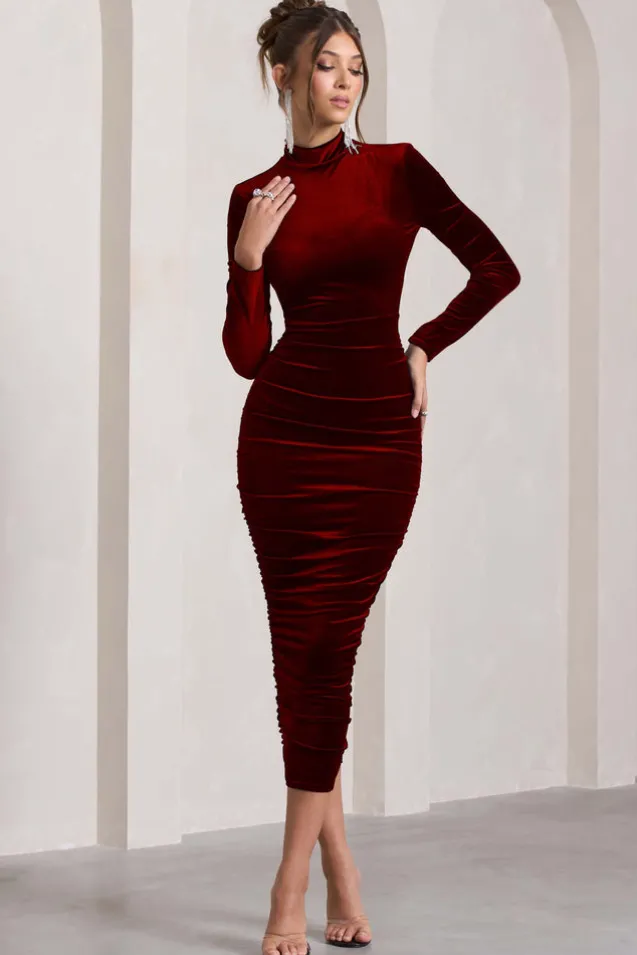Arriving in a timeless, sophisticated silhouette, Joanna is this party seasons must-have. Curated in a luxurious stretch velvet, this sculpting berry midi dress features a demure high neckline, alluring open-back and flattering ruching throughout its skirt. For an elegant work party attire, try styling Joanna with some diamante earrings and strappy stilettos. Features – Premium stretch velvet- Bodycon fit – High neckline – Button-closed collar- Long sleeves- Open back- Ruched skirt- Split hemline – Midi length Sizing & Fit Model is 5’7″ and wears UK size 8/US size 4Product Information Designed exclusively by Club L London Partially lined with good stretch Premium velvet in Berry (95% Polyester, 5% Elastane) 115cm total length