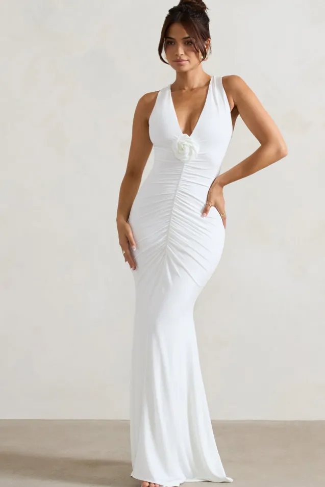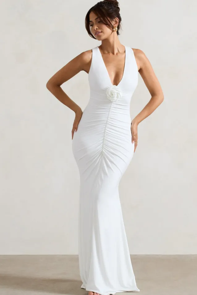 Julianna | White Plunge-Neck Ruched Maxi Dress With Corsage