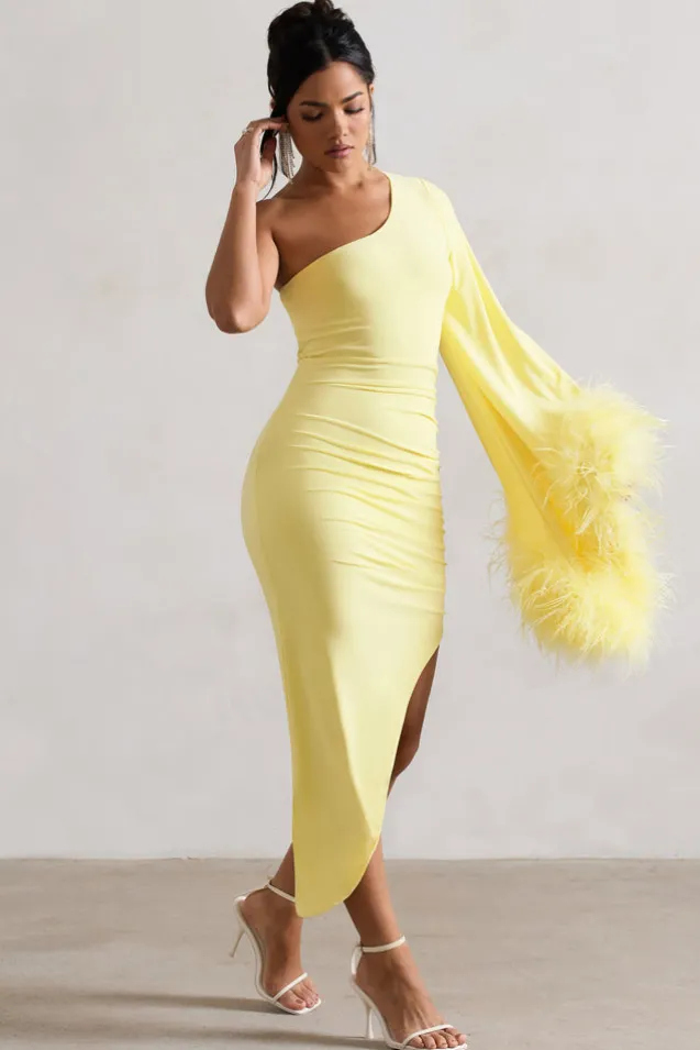 Simple yet lavish, July is perfect for any special event you have coming up. Arriving in a soft lemon shade of our signature stretch jersey, this form-flattering midi is defined by its feather adorned single sleeve, adding a feminine flair. For the perfect summer wedding look, try styling this asymmetric midi with a sleek bun and gold accents.Features – Premium stretch jersey- Asymmetric neckline – Cape sleeve- Invisible zip closure – Feather trim- Gathered skirt- Asymmetric hemline- Midi length Sizing & Fit Model is 5’6 and wears UK size 8/US size 4Product Information Designed exclusively by Club L London Double layered with good stretch Premium jersey in Lemon (95% Polyester, 5% Elastane)Trim: 100% real feathers140cm total length