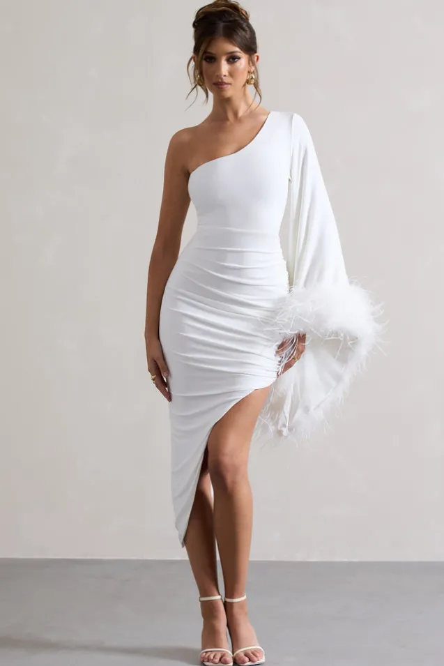 Simple yet lavish, July is perfect for any special event you have coming up. Arriving in a opulent white shade of our signature stretch jersey, this form-flattering midi is defined by its feather adorned single sleeve, adding a feminine flair. For the perfect summer wedding look, try styling this asymmetric midi with a sleek bun and gold accents.Features – Premium stretch jersey- Asymmetric neckline – Cape sleeve- Invisible zip closure – Feather trim- Gathered skirt- Asymmetric hemline- Midi length Sizing & Fit Model is 5’7 and wears UK size 8/US size 4Product Information Designed exclusively by Club L London Double layered with good stretch Premium jersey in White (95% Polyester, 5% Elastane)Trim: 100% real feathers140cm total length