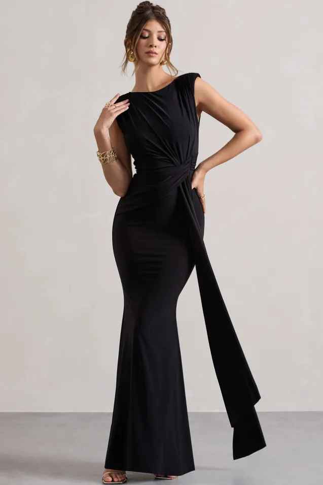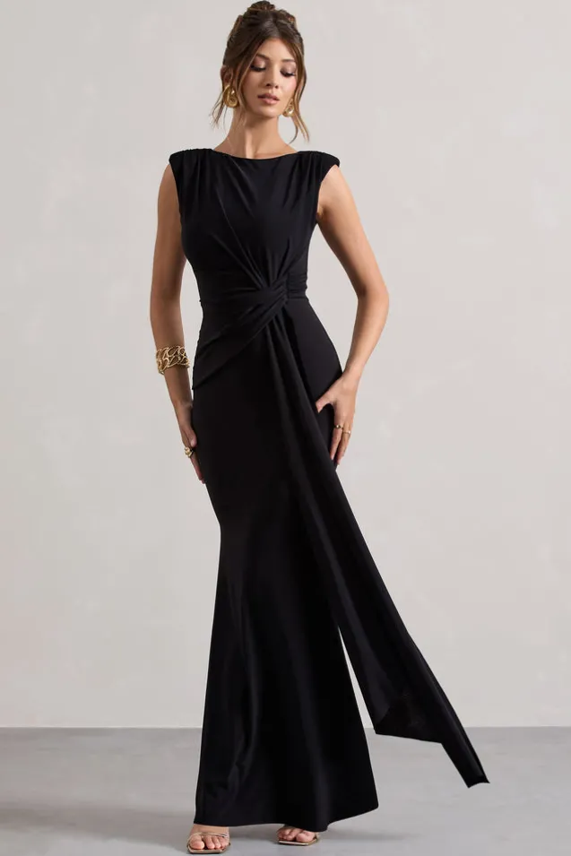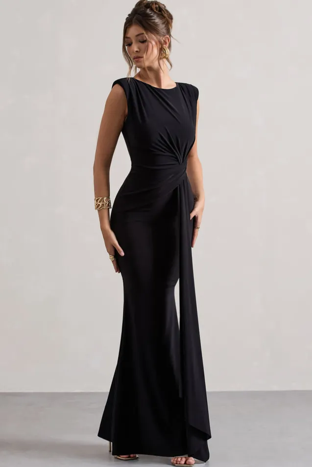 Kadie | Black Sleeveless Gathered Maxi Dress With Drape