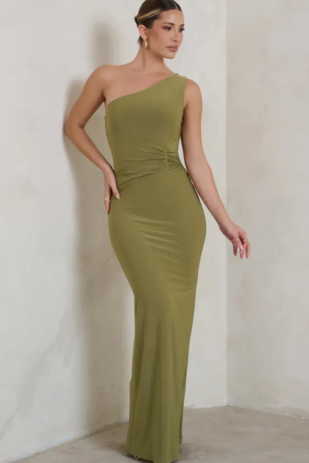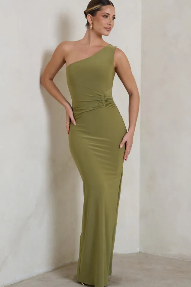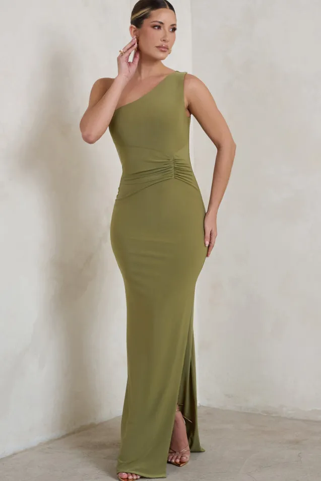 Kary | Olive Green One Shoulder Thigh Split Maxi Dress