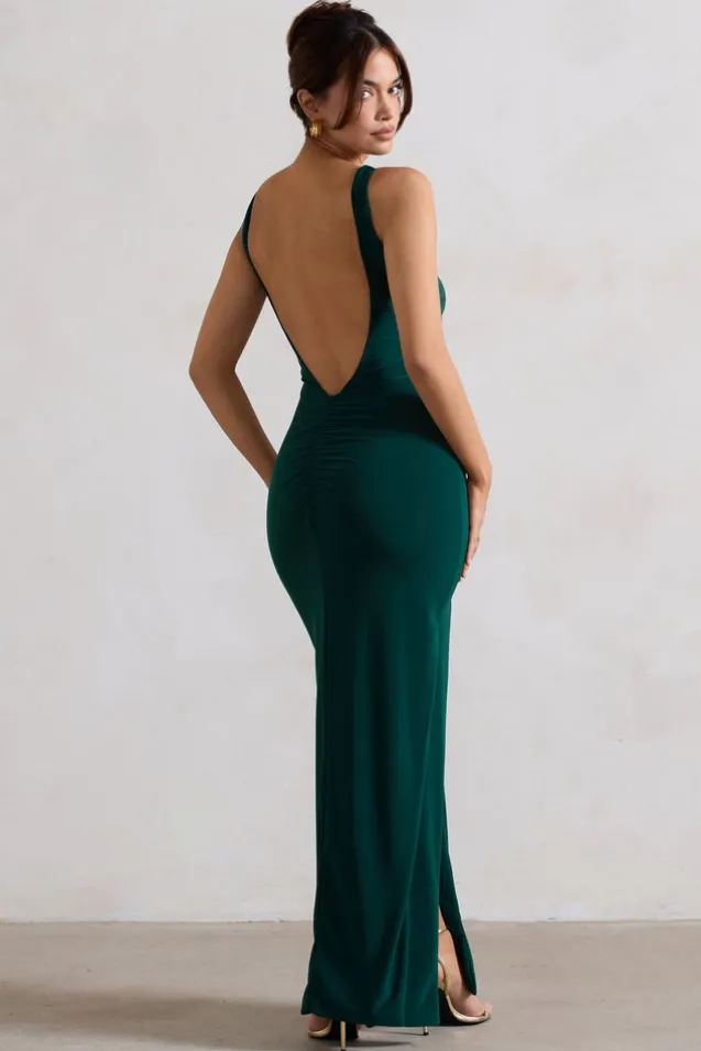 Kate | Bottle Green Square Neck Maxi Dress with Plunge Back and Side Thigh Split