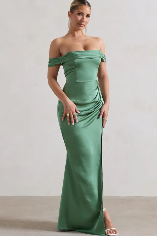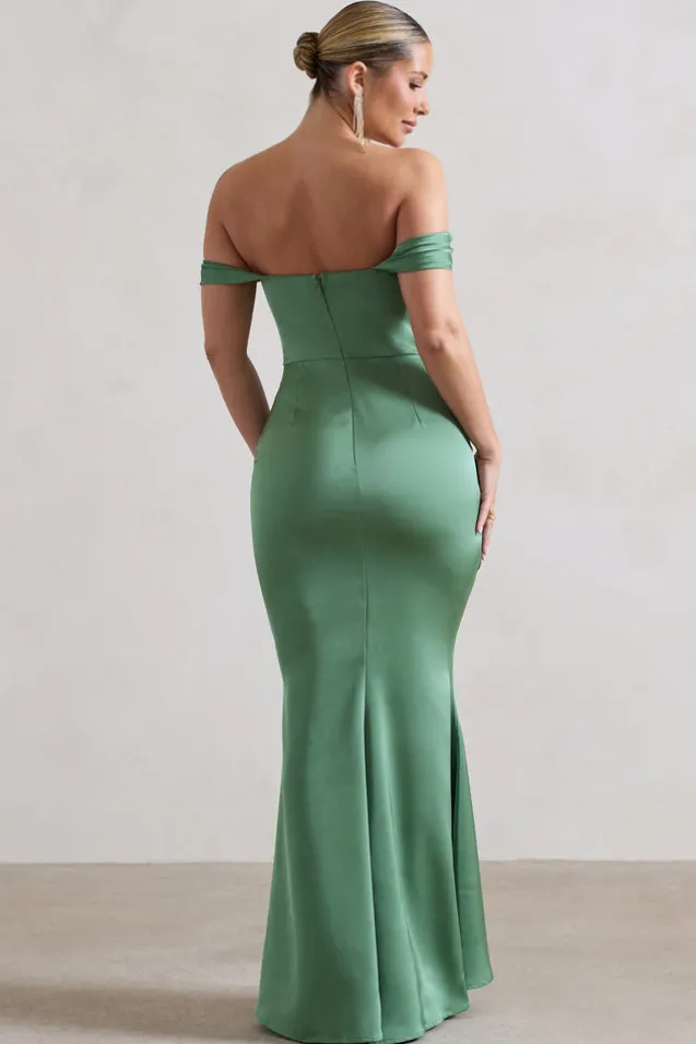 Katia | Soft Green Satin Bardot Fishtail Maxi Dress