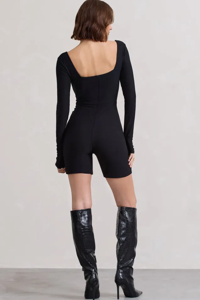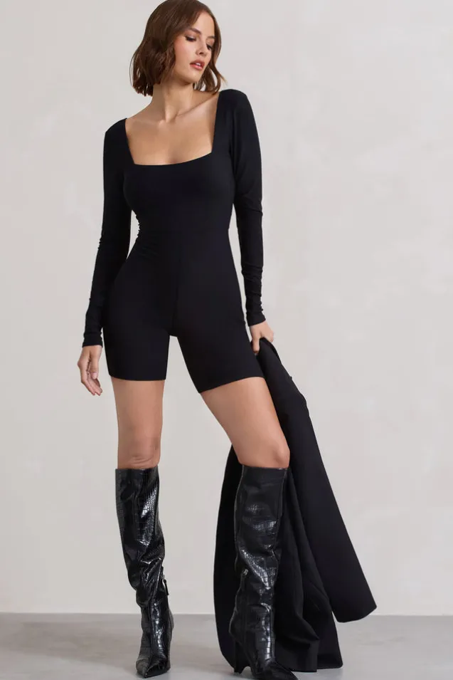 Kayleigh | Black Square-Neck Long-Sleeve Playsuit