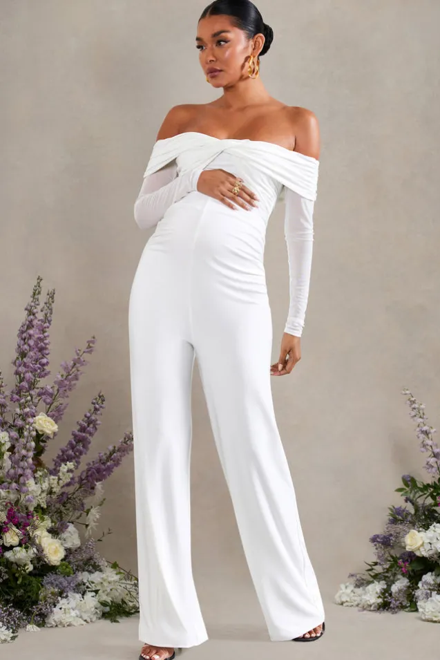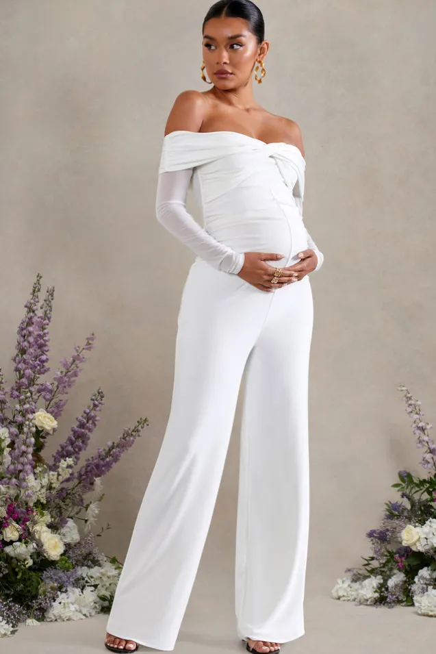 Kyla | White Ruched Bardot Long-Sleeved Wide-Leg Maternity Jumpsuit