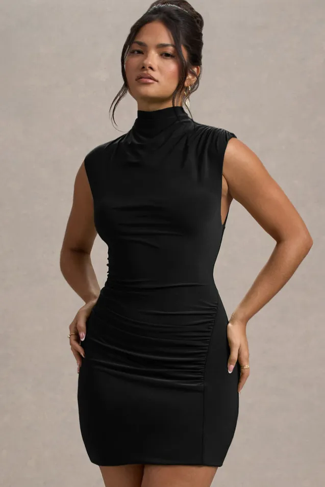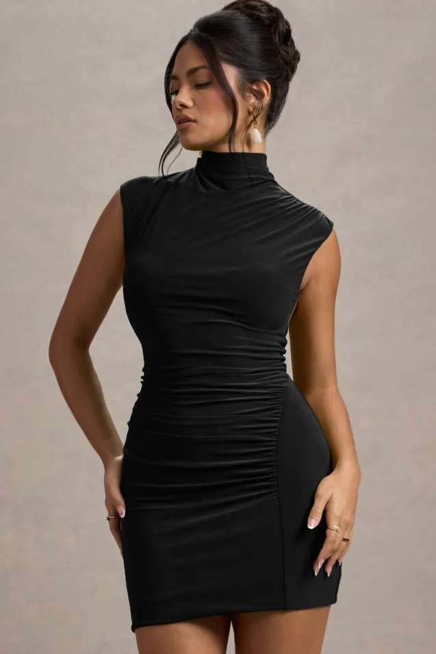 Perfect for those last minute nights out, every wardrobe needs a mini like Lalani. Expertly crafted in our premium dual-layered jersey, this black staple features strategic ruching that effortlessly sculpts your silhouette. For an eye-catching night out ensemble, team yours with some strappy stilettos like Crossed Wires.Features – Premium stretch jersey – Bodycon fit- Partially ruched- High neckline- Invisible zip closure- Mini length Sizing & Fit Model is 5’6 and wears UK size 8/US size 4 Product Information Designed exclusively by Club L London Double layered with good stretch Premium jersey in Black (95% Polyester, 5% Elastane) 85cm total length