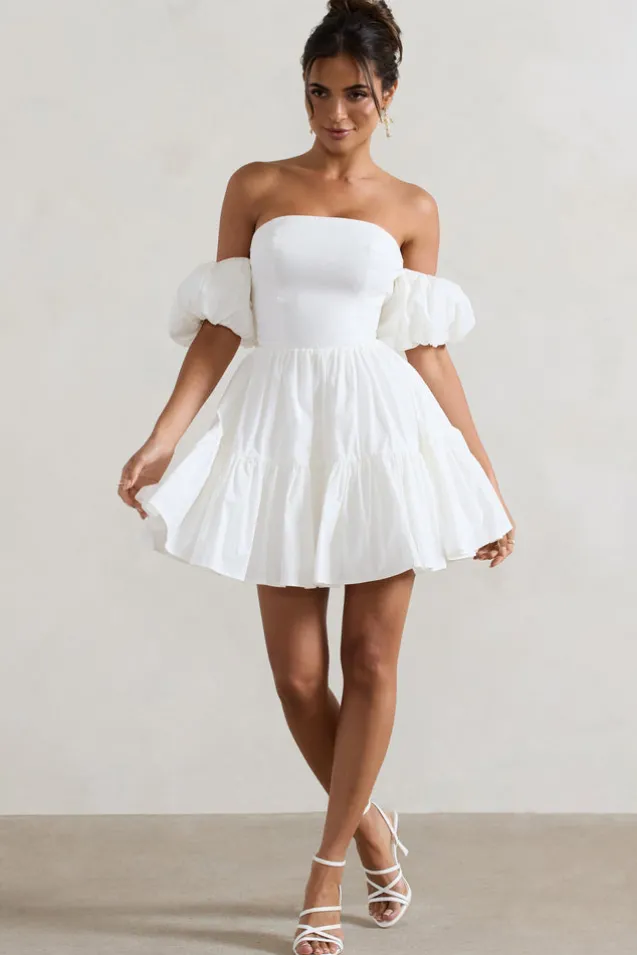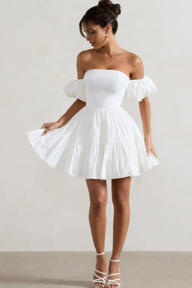 Lani | White Poplin Bardot Tiered Mini Dress With Puff Sleeves