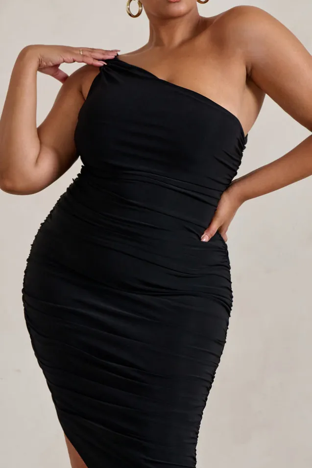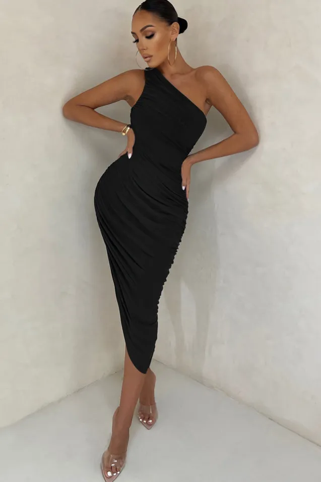 Late Night | Black Asymmetric One Shoulder Ruched Midi Dress