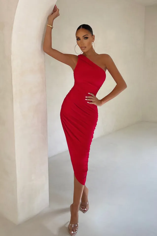 Late Night | Red Asymmetric One Shoulder Ruched Midi Dress