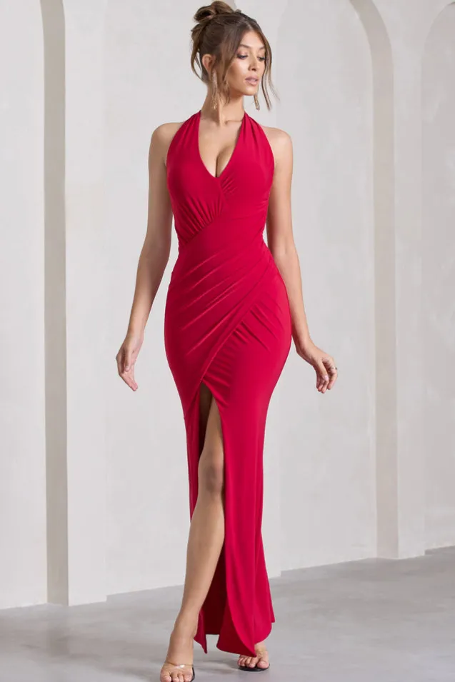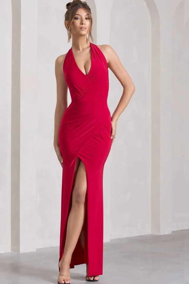 Leonie | Red Halter-Neck Split Maxi Dress With Wrap Detail