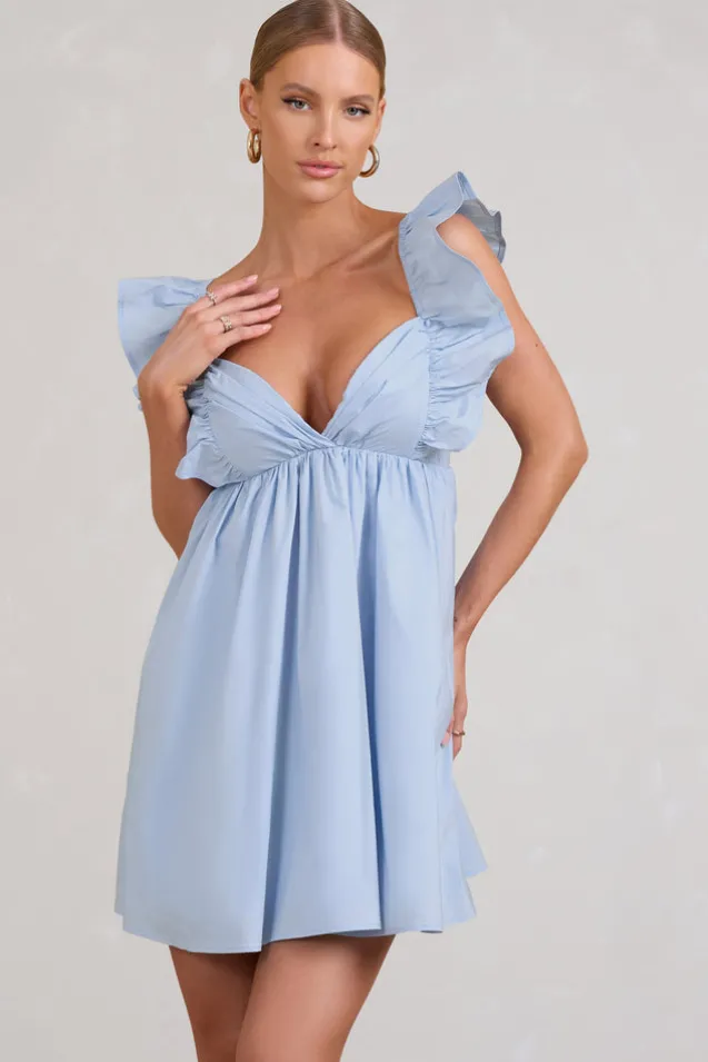 This sweetly smocked mini dress is perfect for the warm months ahead, designed in a comfortable stretchy cotton poplin with short ruffled sleeves for added femininity. Finished with delicate laces that tie across an open back, Let’s Laze is the blue babydoll dress to pack for your next summer escape.Features- Premium stretch cotton poplin- Smocked/ babydoll silhouette- Ruched cups- Elasticated straps- Ruffled sleeves- Invisible zip closure- Mini lengthSizing & FitModel is 5’8 and wears UK size 8 /US size 4Product InformationDesigned exclusively by Club L LondonDouble layered with some stretchPremium cotton poplin in Cornflower Blue (65% Cotton, 35% Polyester)85cm total length