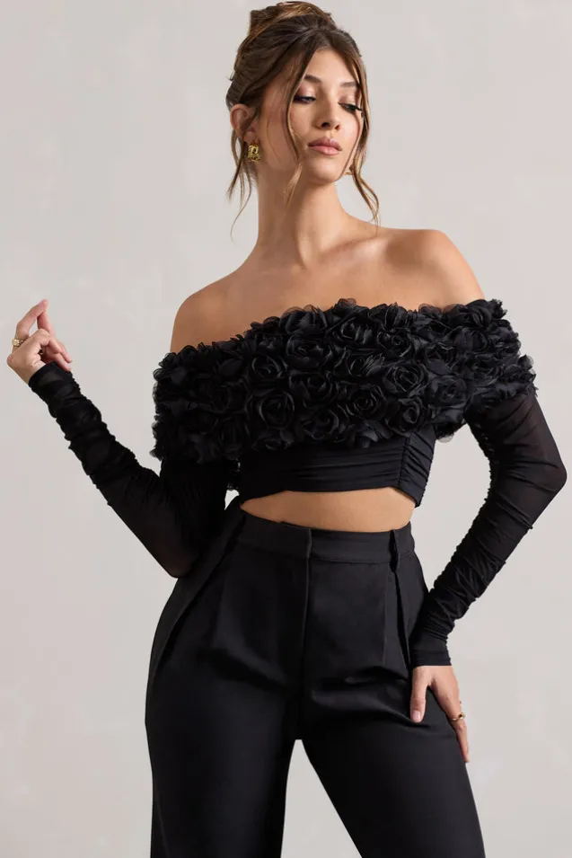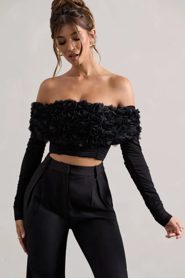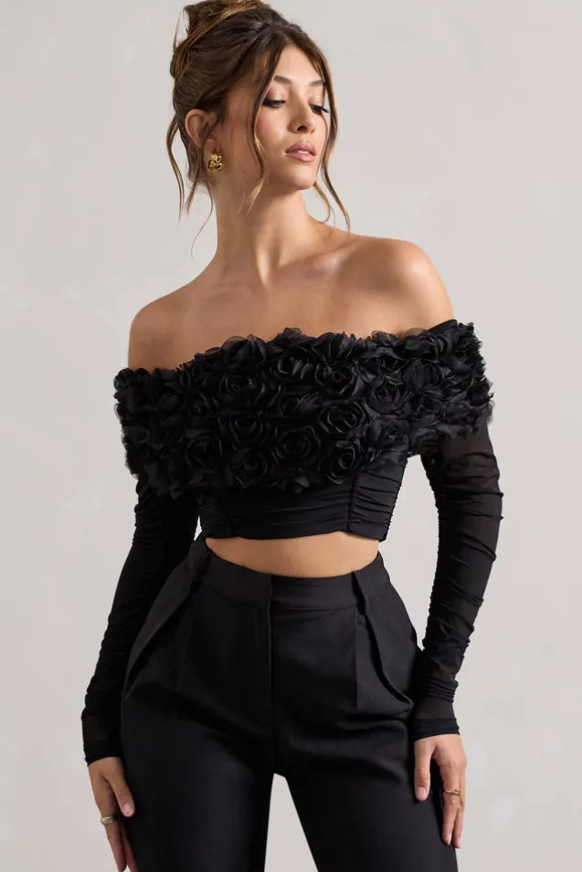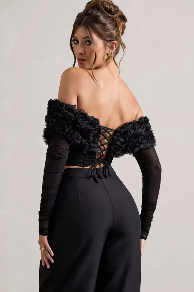 Libbie | Black Mesh Floral Bardot Top