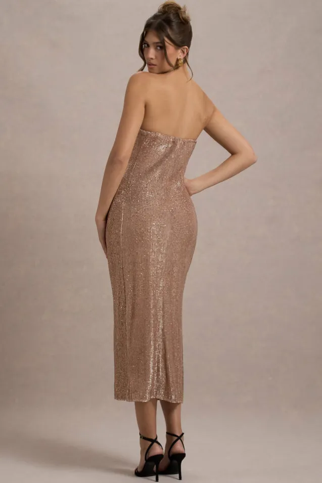Lilabelle | Rose Gold Plisse Sequin Bandeau Midi Dress