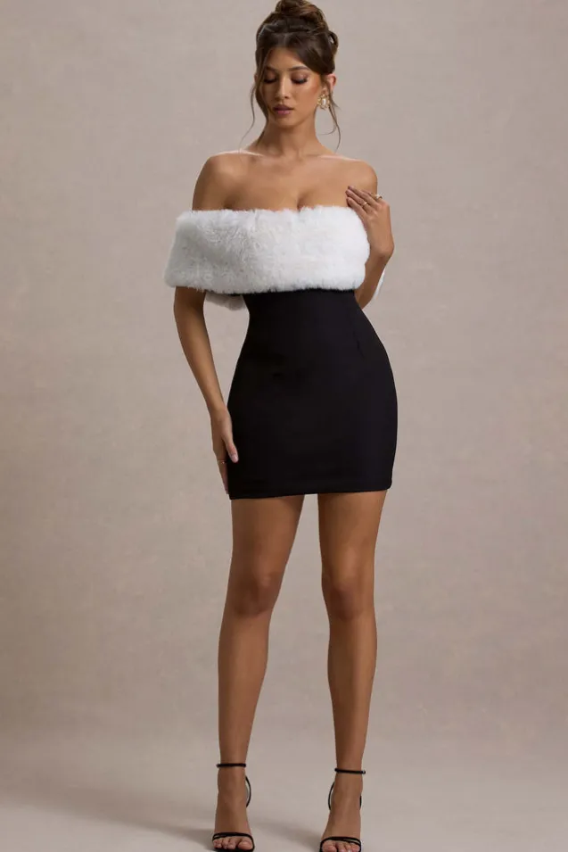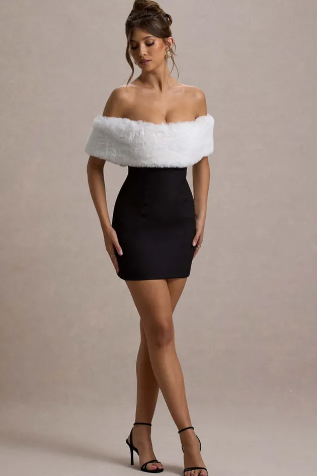 Little Luxe | Black Bardot Mini Dress With White Fur Trim