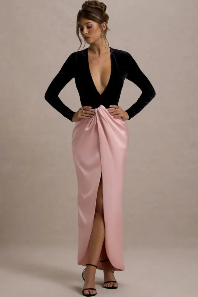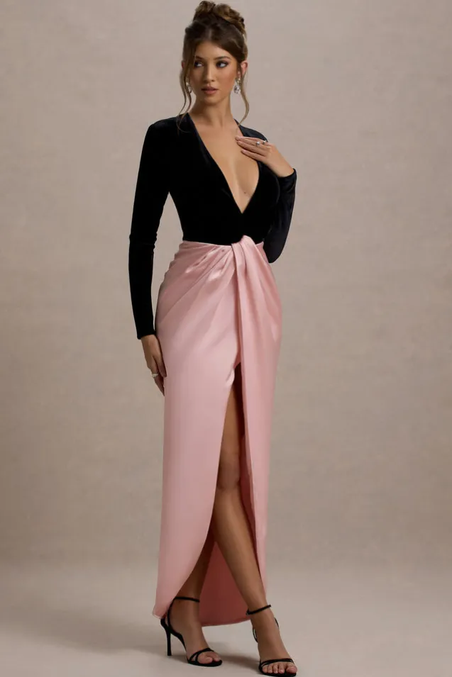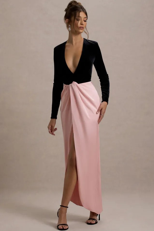 Love Spell | Black Velvet Plunge-Neck Maxi Dress With Pink Satin Skirt