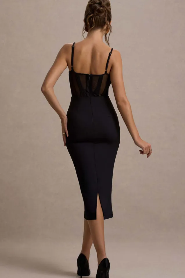 Lucid Dream | Black Strappy Mesh Corset Midi Dress